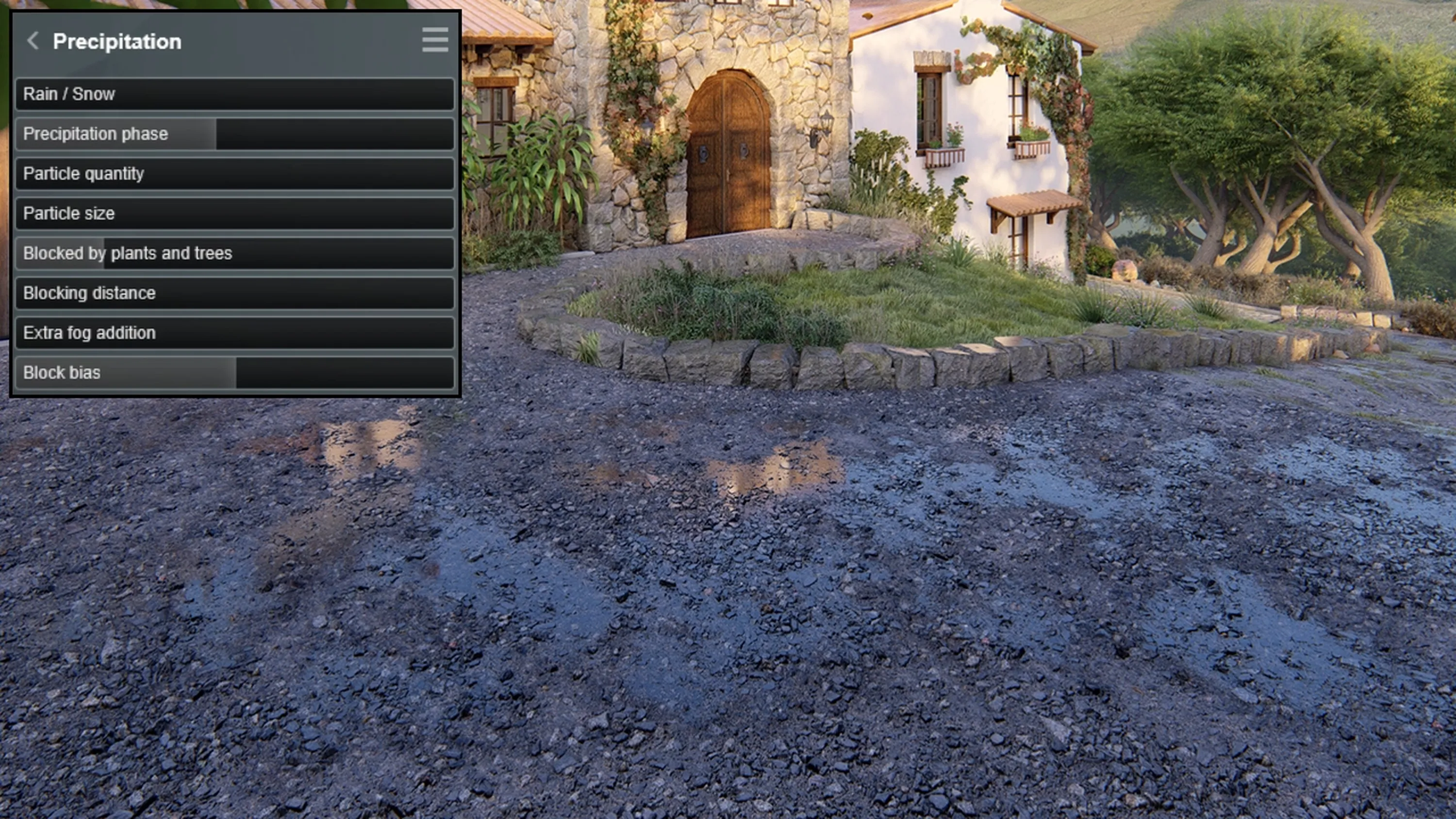 In this shot of the gravel driveway, you can see how we customized the Precipitation effect to show little puddles, reminiscent of freshly fallen rain.