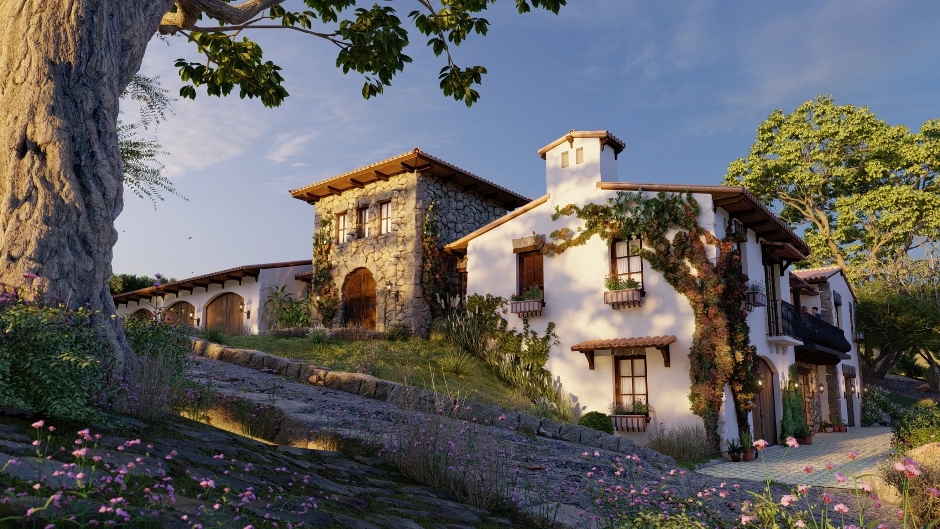 In our final render of the countryside villa, you can see the trunk of the sweet chestnut tree on the left side of the image.